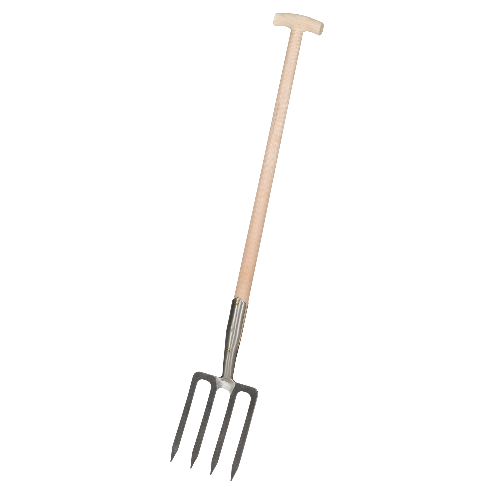 Durch die Form der Zinken und dem speziellen Winkel, in dem der Stiel an der Gabel befestigt ist, dringt dieses Gerät mühelos in den Boden ein. Im Vergleich zu einem Spaten schneidet eine Grabegabel nicht durch den Boden. Dadurch wird das empfindliche Wurzelsystem beim Graben nicht beschädigt und die Pflanzen bleiben gesund. Die Grabegabel ist in mehreren Varianten mit drei oder vier Zinken sowie in einer kleineren Ausführung erhältlich. Diese Grabegabel wird mit einem 90 cm langen T-Griff oder einem 85 cm langen D-Griff aus Eschenholz geliefert. Darüber hinaus bieten wir eine Vintage-Version an, die mit einem robusteren, dunkelbraunen T-Griff geliefert wird.