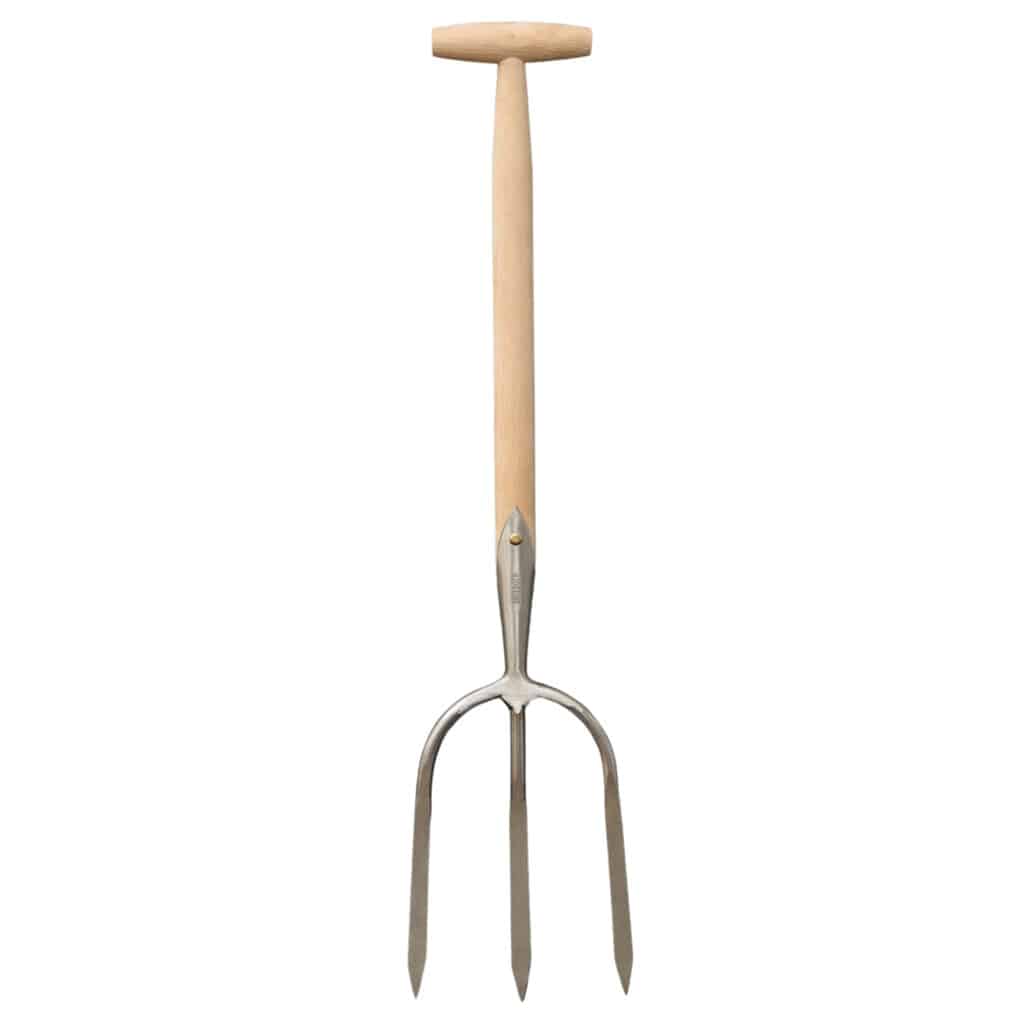 Diese traditionelle Gabel mit T-Griff und drei Zinken ist ideal, um Kartoffeln unversehrt aus dem Boden zu heben. Die drei geschärften Zinken lassen sich mühelos tief in den Boden treiben, während der kurze Stiel ein präzises Arbeiten in Bodennähe ermöglicht. Außerdem eignet sich die Erntegabel zum Herausreißen von Sträuchern, Hecken oder anderen Pflanzen, deren Wurzeln unversehrt bleiben sollen.