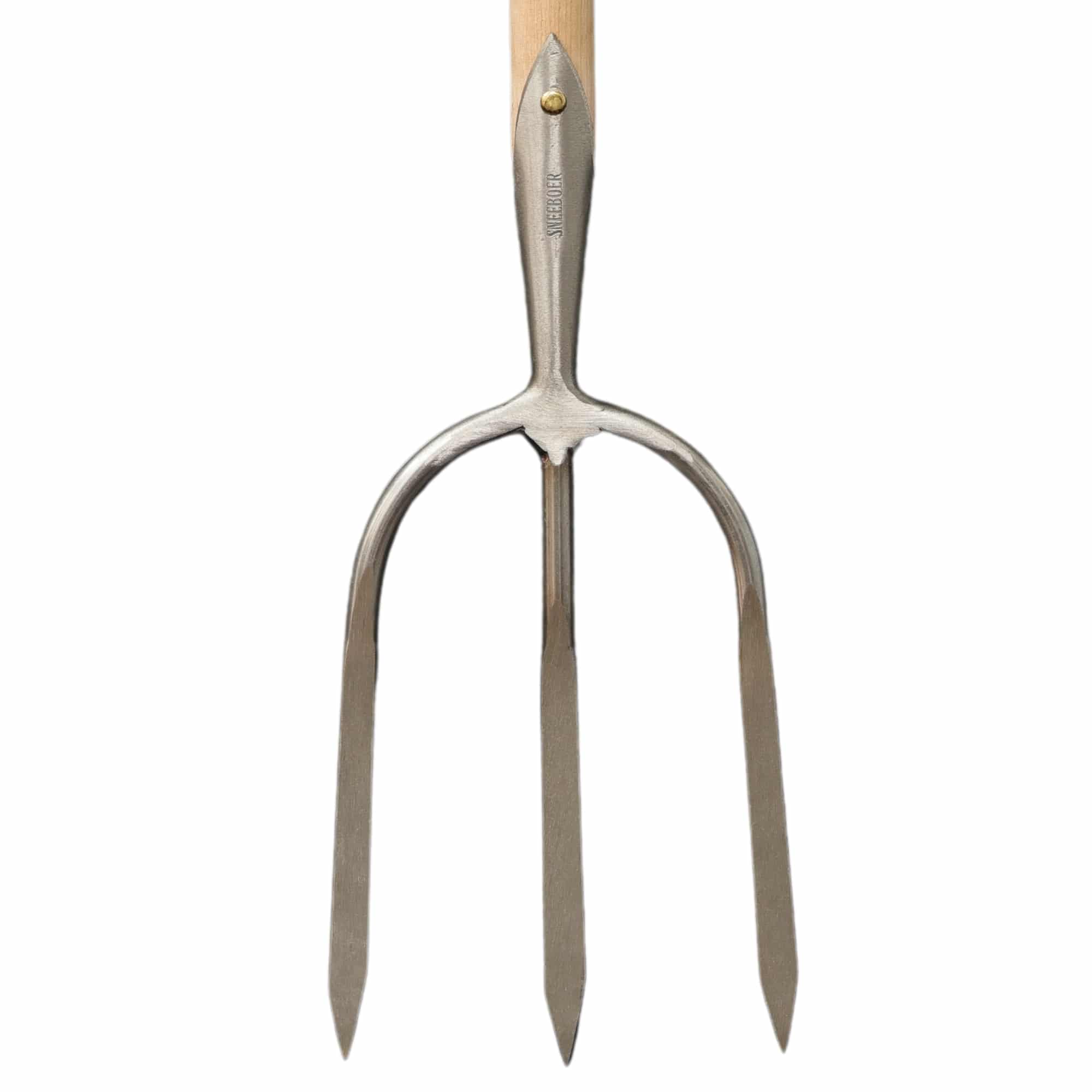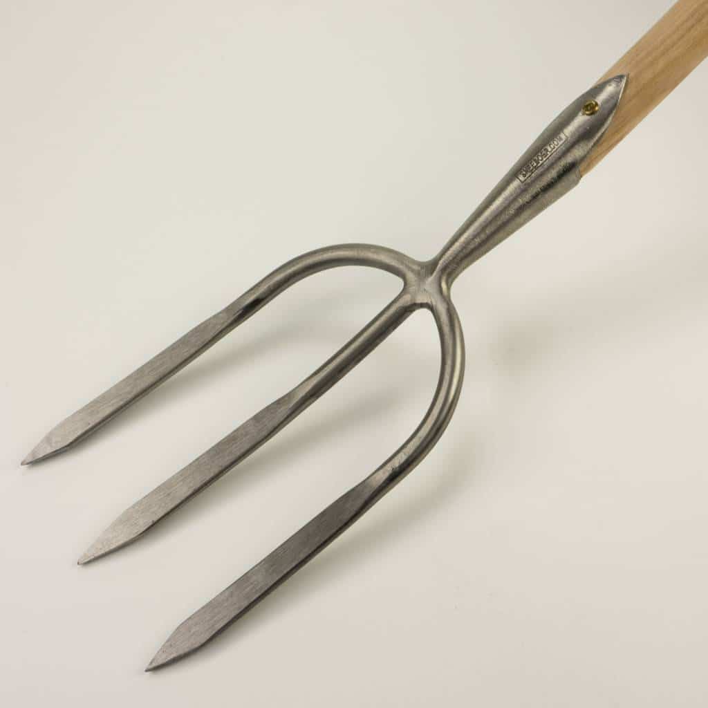 Die Rückseiten der drei Zinken sind V-förmig ausgearbeitet, während die Vorderseiten flach sind. Der Griff ist kurz, aber sehr stabil, so dass bei Bedarf viel Kraft aufgewendet werden kann. Die Erntegabel hilft nicht nur beim Ausgraben von Kartoffeln, sondern kann auch zum Ernten von Lauch und anderen Gemüsesorten und Pflanzen verwendet werden, bei denen die Wurzeln intakt bleiben sollen. Die Erntegabel ist auch mit vier Zinken erhältlich.