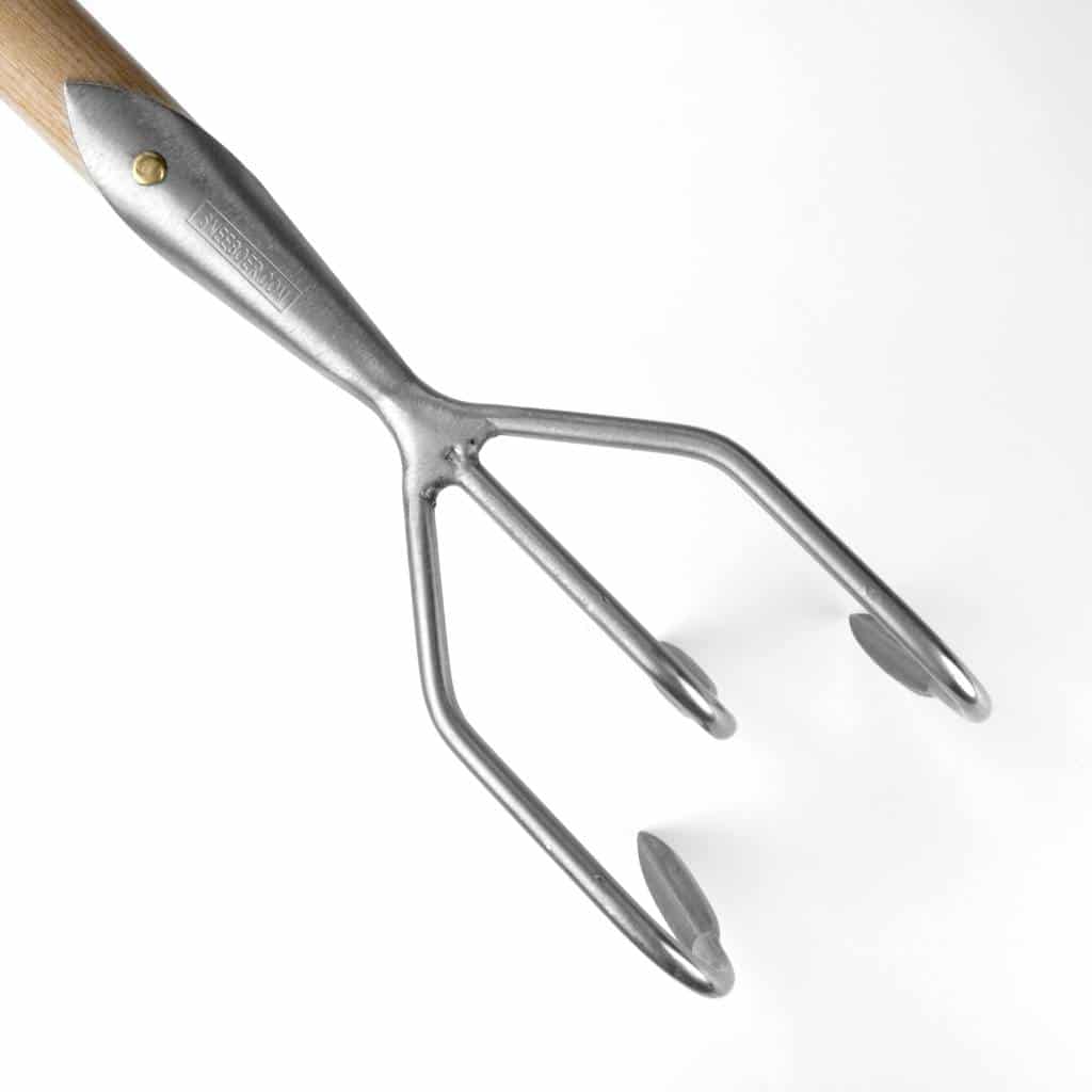 The cultivator has three sharp, bent tines which make light work of breaking up soil as the three tines deeply pierce the soil. Breaking up the top layer of soil allows air, light, water and other nutrients to be stored in the lower parts of the soil where the plant roots are located. The cultivator has long tines so it can break through a thick layer of soil and the angle of the teeth allows the tool to be pulled through the soil with ease. This tool is comparable to the function of a plough and as such, the tines are wider at the bottom compared to the top of the tine.