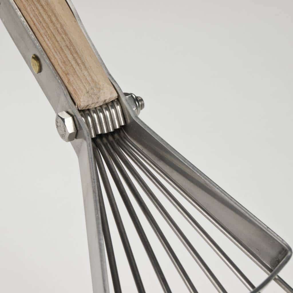 De bladhark is verkrijgbaar in de smalle variant met zeven tanden en in een grote variant met 20 tanden en is voorzien van een essenhouten steel.