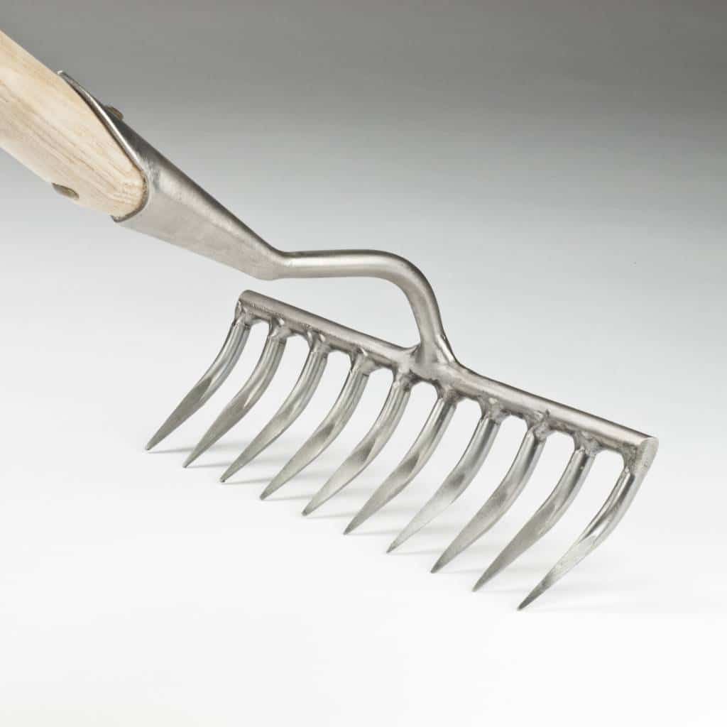 De fijnhark is ideaal om het zaaibed perfect te egaliseren, materiaal te verzamelen en de grond te verkruimelen. De fijnhark heeft een smallere kop, waarbij de tanden vrij dicht bij elkaar staan. Zo kan kleiner gruis, stenen en ander afval makkelijker worden meegenomen. De tien tanden zijn scherp gesmeed en naar binnen toe gebogen om de duw-en-trek beweging te bevorderen. De tuinhark is het gereedschap bij uitstek om uw tuin op te ruimen. De fijnhark met 10 tanden is net iets breder dan de tuinhark met 6 tanden maar is dus voorzien van vier extra tanden waardoor deze slechts 1,5cm uit elkaar staan en de aarde nog fijner aangeharkt en verkruimeld wordt.