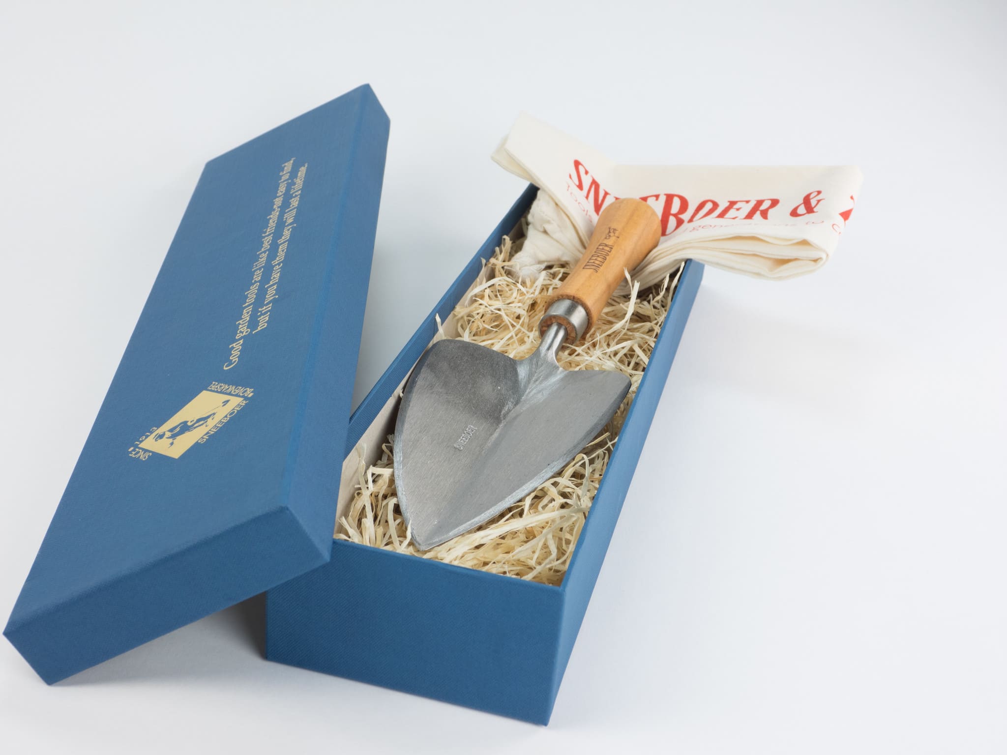 Een milieubewust en origineel cadeau voor o.a. relaties of werknemers is bij Sneeboer geen enkel probleem. De gereedschappen van Sneeboer zijn het beste tuingeschenk dat u kunt geven, al dan niet met een ingegraveerde persoonlijke boodschap. De prachtige blauwe doos is afgewerkt met gouden letters en maakt uw geschenk extra speciaal. Het medium pakket is gevuld met een verplantschopje en uitgevoerd met een heft van kersenhout.
