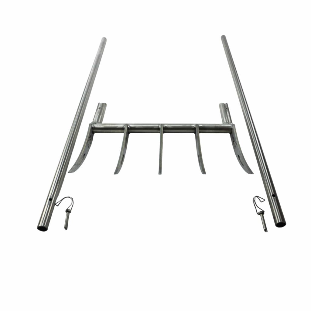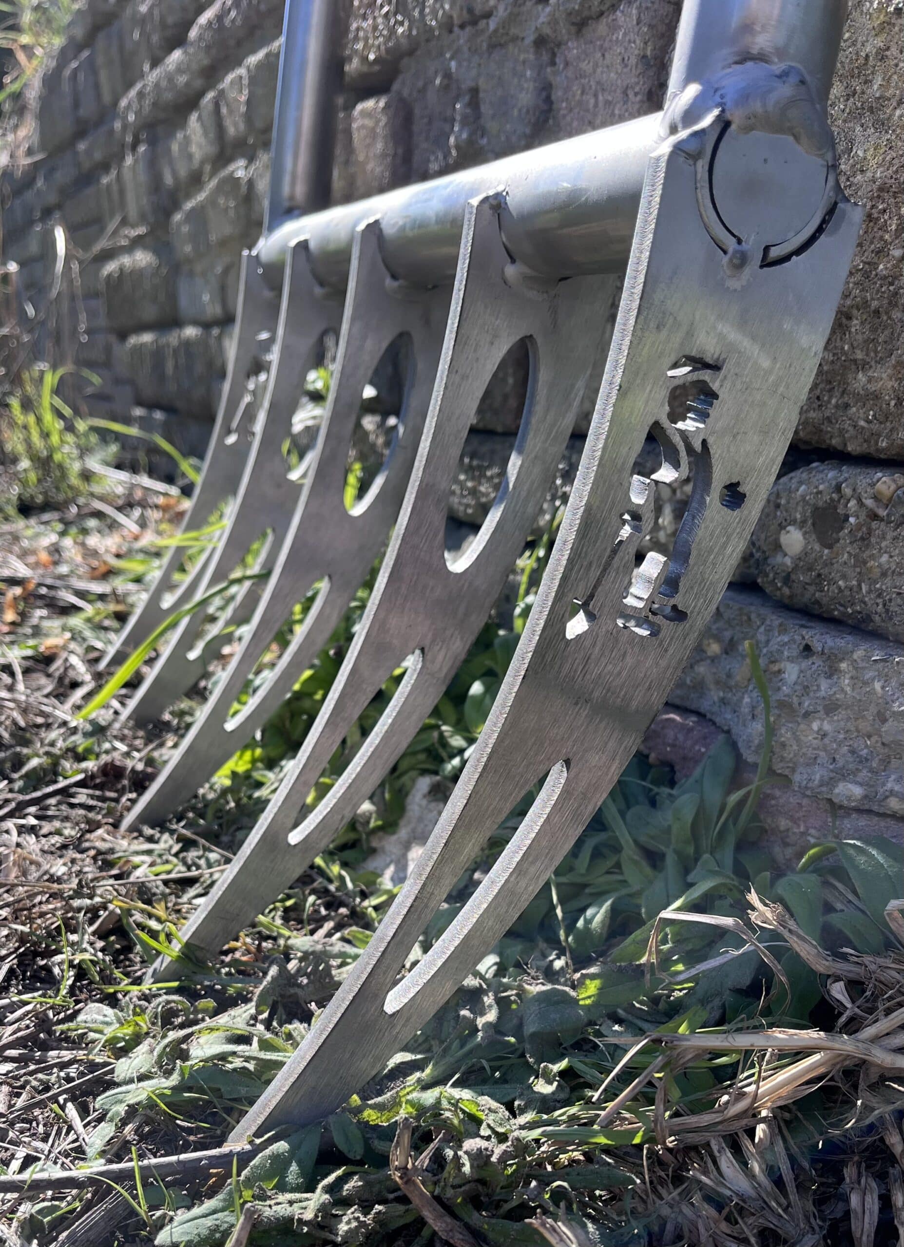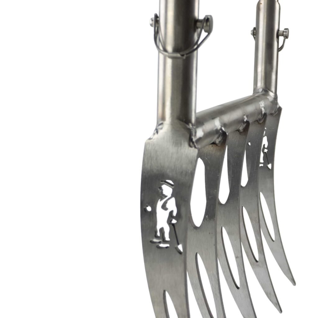 Deze Broadfork is helemaal hand gemaakt van hoge kwaliteit rvs zoals u van Sneeboer tuingereedschap gewend bent. De totale vork weegt 7,3kg en de 5 tanden zijn 25 cm lang. De totale vork is 50 cm breed en met de stelen gemonteerd is de vork 145 cm lang. Deze rvs stelen zijn 120 cm lang en demonteerbaar zodat u de vork met gemak kunt vervoeren. In de buitenste twee tanden hebben wij het Sneeboer logo gesneden en deze details maken dat deze vork er net zo fantastisch uit ziet als dat hij in gebruik is.