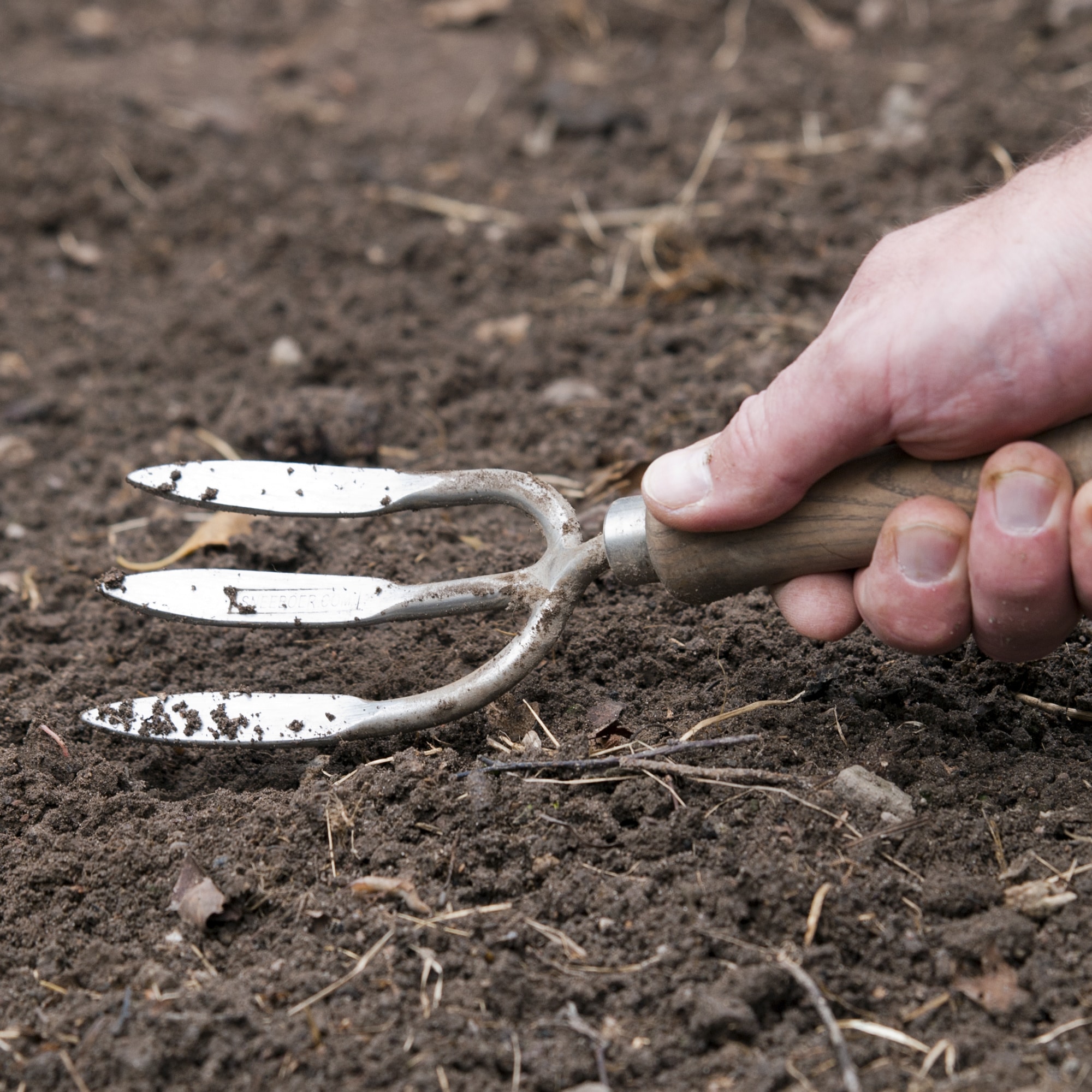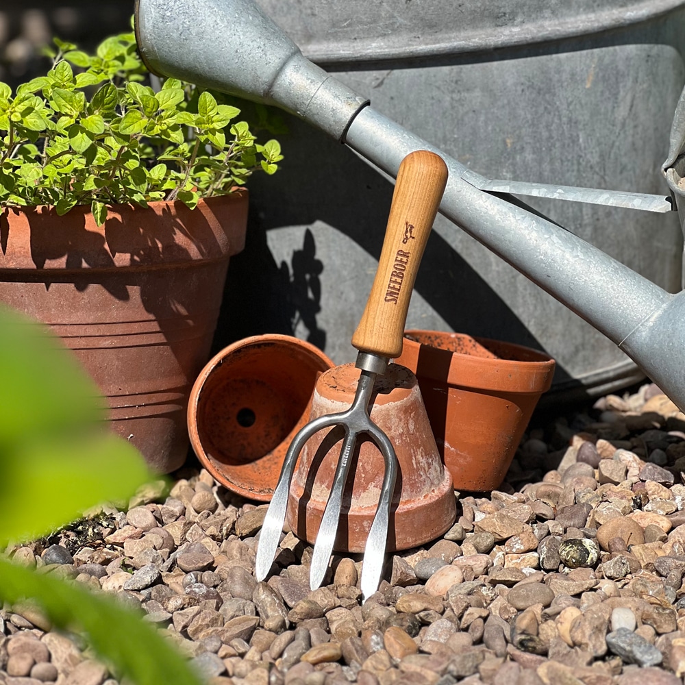 Het handrooivorkje is een handig gereedschap om gewassen te verplanten zonder daarbij de wortels te beschadigen. Het handrooivorkje is verkrijgbaar met handvatten van essen- of kersenhout.
