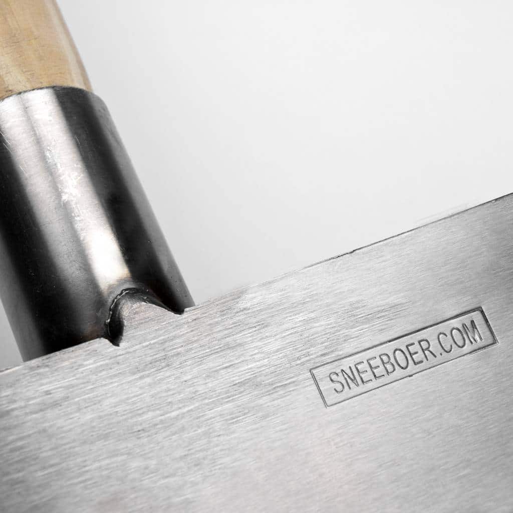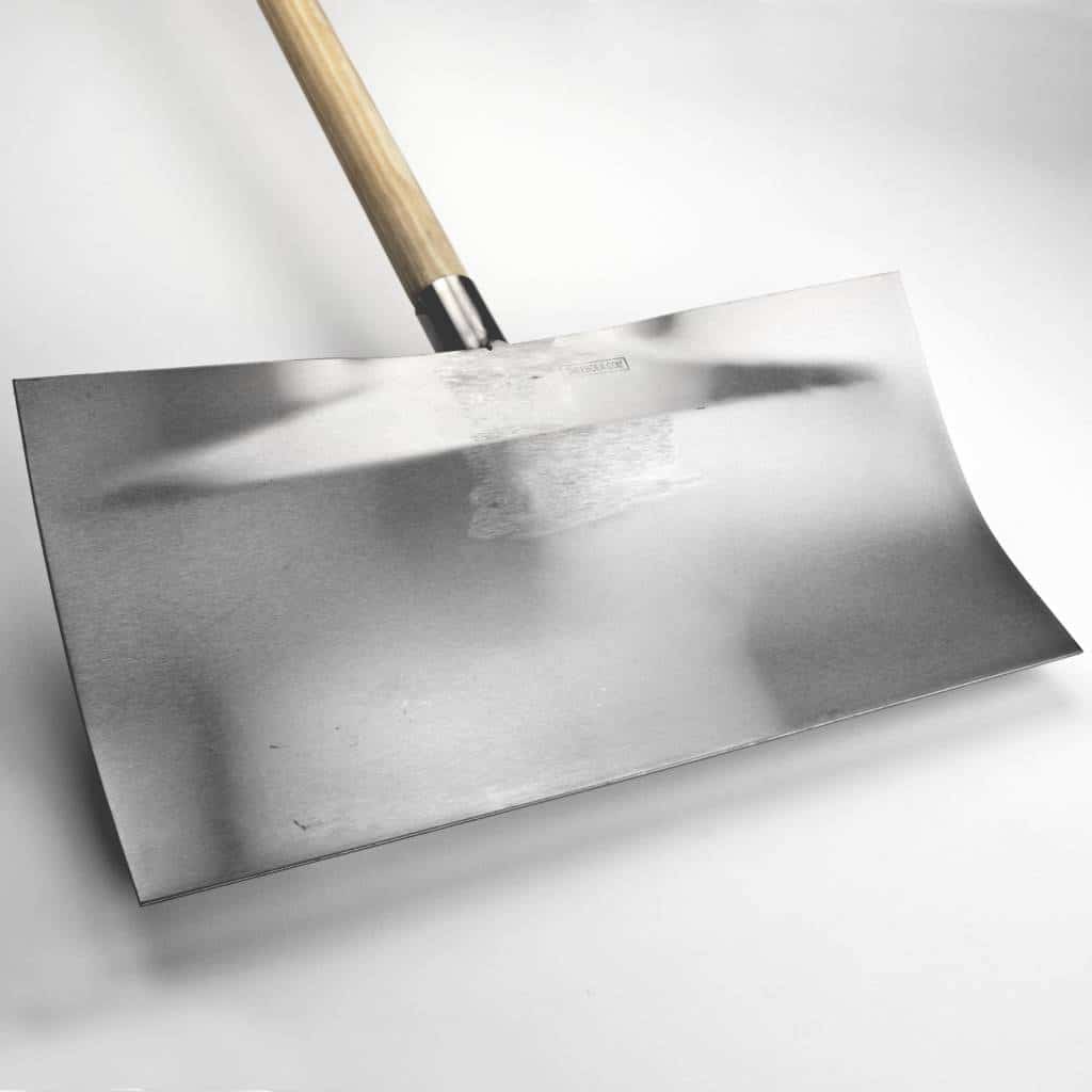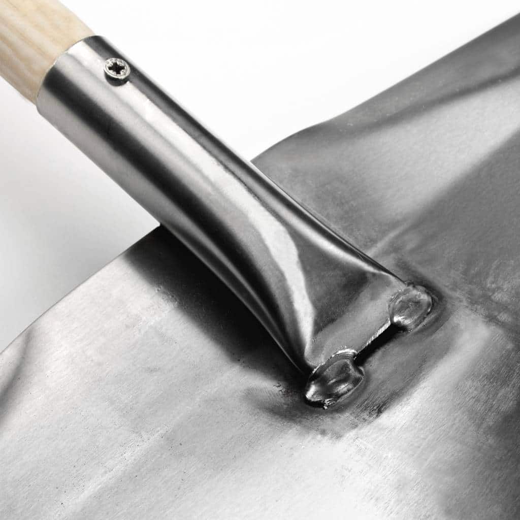 Het roestvaststalen blad van 40cm bij 20cm is aan de achterkant aan de steelhouder gelast. De sneeuwschuiver wordt geleverd met een essenhouten steel.